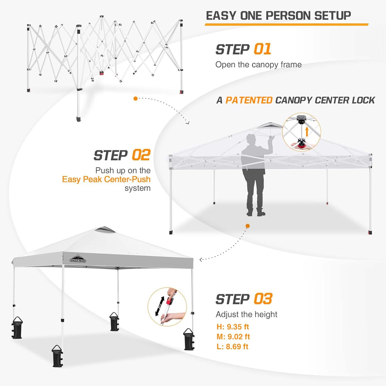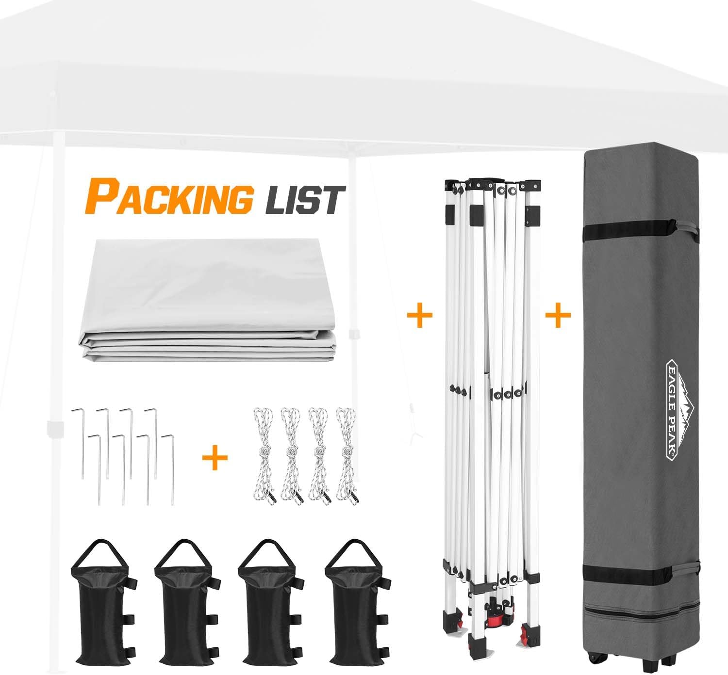 Easy Assembly: The EASY Peak center-pull design eliminates the need for locking and unlocking rails, allowing one person to easily open and close the awning from the center. A gentle push is all it takes no pinching your hands! Double-Layer Canopy for Ventilation: The EAGLE PEAK's ventilation system ensures better airflow, keeping you cool whether you're working or relaxing. Three-position push-button telescopic steel legs for easy adjustment. The straight-leg design provides maximum coverage, allowing 6 or more people to enjoy 100 square feet of shade. Superior Quality: The flame-retardant CPAI-84 certified awning is waterproof and offers superior UPF 50+ UV protection. The Eagle Peak frame is constructed from premium powder-coated steel and finished with M5 reinforced concrete and nylon plastic hardware. Lightweight and Portable: Easily take this awning anywhere using the included 600x300D wheeled carrying case. Our wheeled carrying case is compact and lightweight, fitting into most car trunks. Easy to carry to the beach, park, or anywhere you want to go! Eagle Peak promises: Eagle Peak offers a one-year limited warranty from the original date of purchase. Unlike many other hat manufacturers, Eagle Peak offers this warranty on our frames, awnings, and bags! For any questions, please contact our professional team. We always listen to our customers and evaluate our products to ensure we provide high-quality, easy-to-use, versatile, and durable solutions.