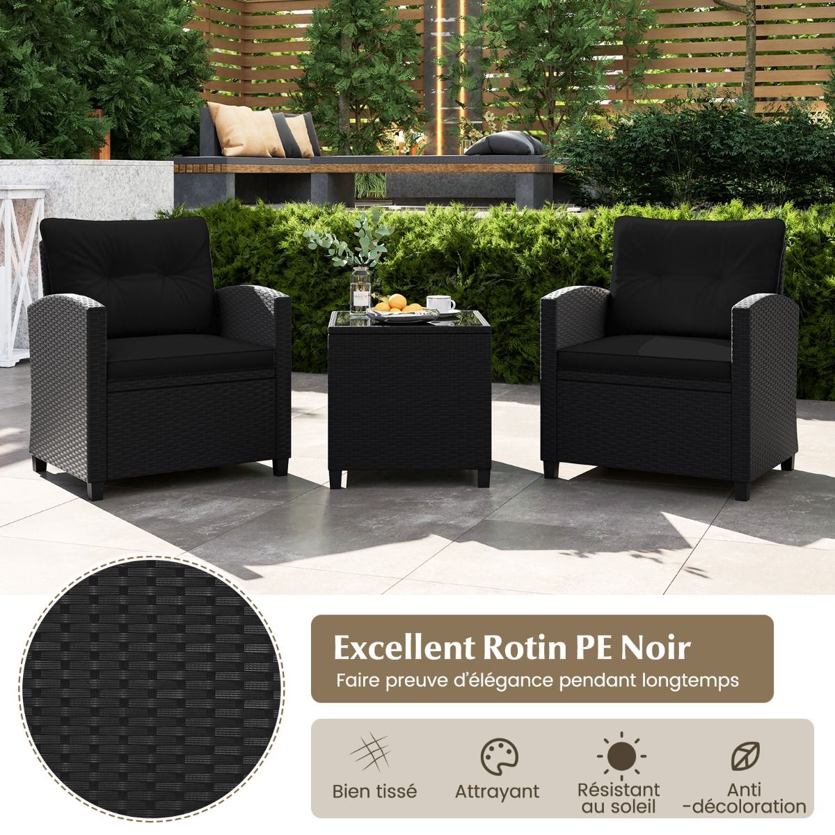 This three-piece rattan outdoor furniture set enhances your outdoor leisure time. The two armchairs and coffee table are all woven, durable, colorfast, and exude elegance. The soft, comfortable zippered seat cushions not only provide a comfortable seating experience but also make daily cleaning easy. The stylish glass-topped coffee table not only makes it easy to access items but also enhances the overall aesthetic. Whether by the pool or in the garden, this furniture set blends perfectly into various environments, creating a tranquil and relaxing social space. Product Features: The Beauty of RattanThis three-piece outdoor furniture set is woven from high-quality black PE rattan, adding a natural and charming appeal to any outdoor decor. The exquisitely woven rattan surface is not only beautiful but also sun-resistant, fade-resistant, and durable. Comfortable SeatingTwo outdoor chairs with cushions provide ultimate comfort. The cushions are filled with elastic fibers to ensure unparalleled comfort for every seat. Furthermore, the zippered seat covers make cleaning and maintenance easy and convenient. Ergonomic and Durable SeatingThe chairs feature curved backrests and armrests designed for comfort. Furthermore, the reinforced metal frame and sturdy support legs allow each chair to support up to 180 kg. Elegant Coffee TableComplementing the chairs, this outdoor furniture set also includes a stylish coffee table with a tempered glass top, perfect for placing drinks, books, or decorative items. Four suction cups securely hold the top in place for added stability. Ideal for Outdoor RelaxationThis set of three rattan outdoor chairs is perfect for any outdoor space, such as a patio, poolside, or garden, transforming your space into a comfortable place to relax, socialize, or quietly read. Chair dimensions: 65 x 66 x 76 cm. Coffee table dimensions: 50 x 50 x 52 cm. Features: Woven from stylish and durable PE rattan. Thickened seat cushions ensure comfort even during long periods of sitting. Smooth zippers make the seat covers easy to remove and wash. The curved backrest and armrests provide optimal comfort. A sturdy metal frame offers stable support. The coffee table with a tempered glass tabletop adds convenience. Suitable for gardens, poolside, or balconies. To extend its lifespan, avoid rain. Specifications: Seat cushion color: Black/Beige/White; Rattan color: Black; Material: PE rattan, metal, tempered glass, polyester, sponge; Chair dimensions: 65 x 66 x 76 cm (L x W x H); Coffee table dimensions: 50 x 50 x 52 cm (L x W x H); Seat cushion dimensions: 54 x 51 x 7 cm (L x W x D). Backrest cushion dimensions: 58 x 45 x 12 cm (Length x Width x Depth) Seat height: 35 cm Seat depth: 51 cm Chair weight capacity: 180 kg Coffee table weight capacity: 75 kg Total net weight: 24.5 kg Package includes: 2 outdoor chairs, 1 coffee table, 2 seat cushions, 2 backrest cushions, 1 instruction manual